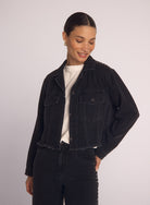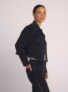 Edgy meets effortless in the Studded Jacket. This modern take on a denim classic is defined by a cropped, boxy silhouette with raw hem detailing. A line of subtle studs across the back adds just the right amount of edge, making it a versatile layer that transitions seamlessly from day to night. Pair it with everything from wide-leg trousers to your favorite denim for a cool, laid-back vibe.