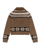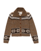 The Nordic Scholar Cardigan brings a fresh take on traditional knitwear with a classic Fair Isle motif accented by Greek key and floral patterns. Knit from a soft alpaca blend, it’s detailed with an oversized collar, raglan sleeves, ribbed trims, and real leather buttons. A relaxed fit with refined proportions makes it as cozy as it is timeless.