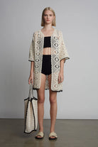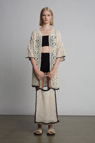 The Vera tote is a hand-crocheted essential, perfect for summer days and getaway adventures. Its sturdy, modern mesh-stitch design is framed with contrasting black crochet, while the two-tone tick-stripe handle adds a bold touch. The perfect companion for beach days or poolside lounging—just pair it with the Violet Crochet Cover-up and you're ready to go.