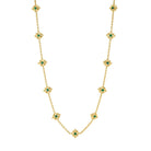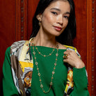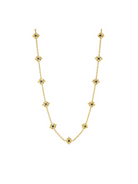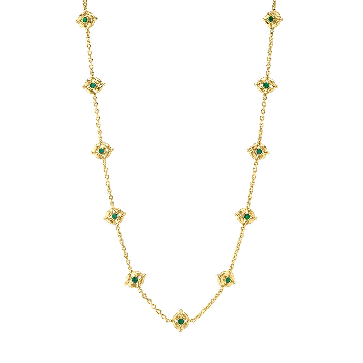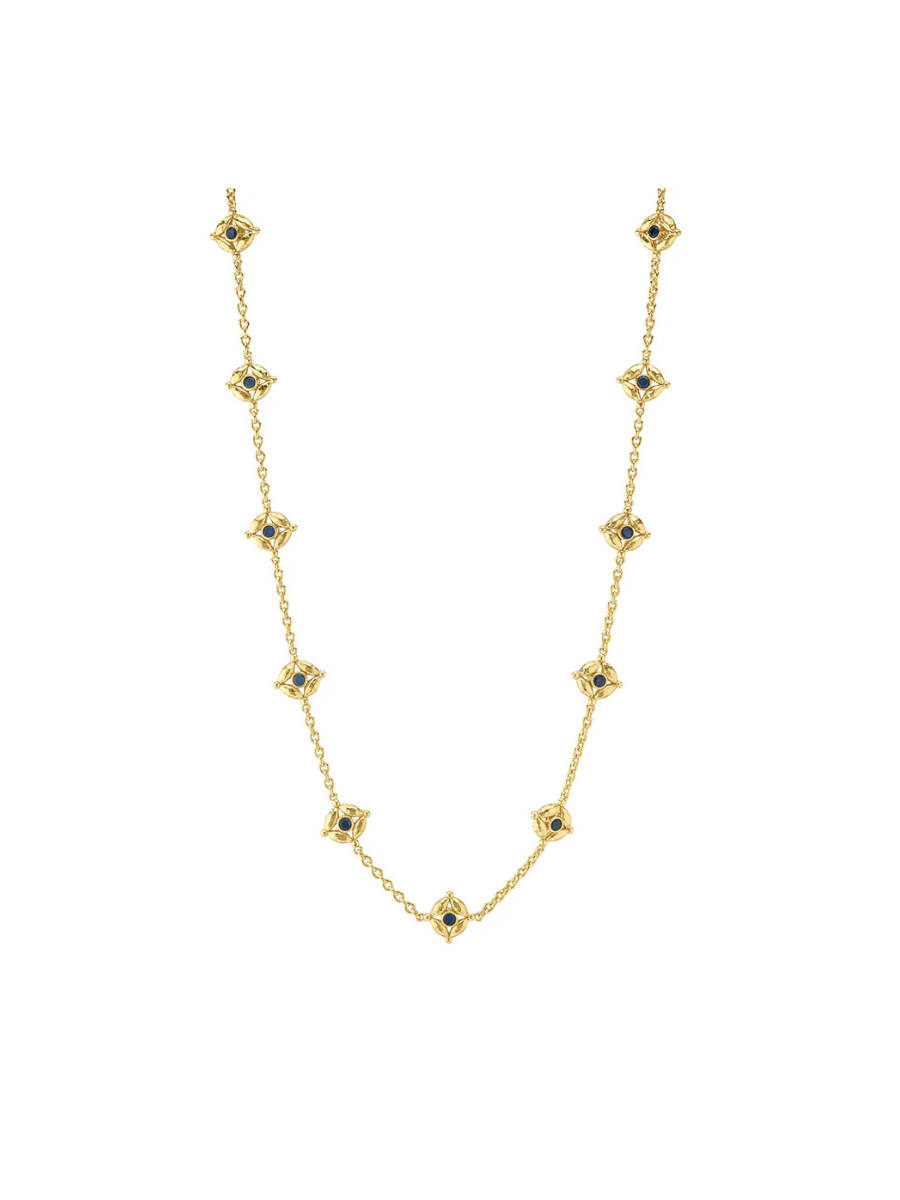 The Mystic Eye Chain Necklace is a striking double-sided design in gleaming gold, accented with all-seeing eyes of lush green onyx and deep blue labradorite. Playful and versatile, the gemstone settings flip throughout the day for a wink of color and intrigue. Mystical yet modern, this necklace symbolizes the balance between heart and head—reminding you to trust your instincts. Wear it long for drama or double it up for a layered look that shines with meaning.