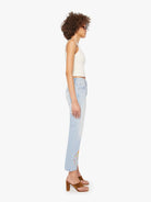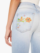 Designed to sit low on the hips with a relaxed, slouchy fit, these jeans feature a super high rise, slightly dropped crotch, flared leg, and ankle-length inseam. Crafted from semi-rigid SUPERIOR denim, Going Out On A Limb is a light blue wash with playful embroidered flowers and mushrooms at the hip and ankle, plus subtle whiskering and fading at the knees for a lived-in feel.