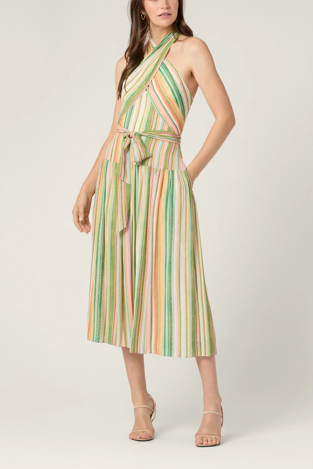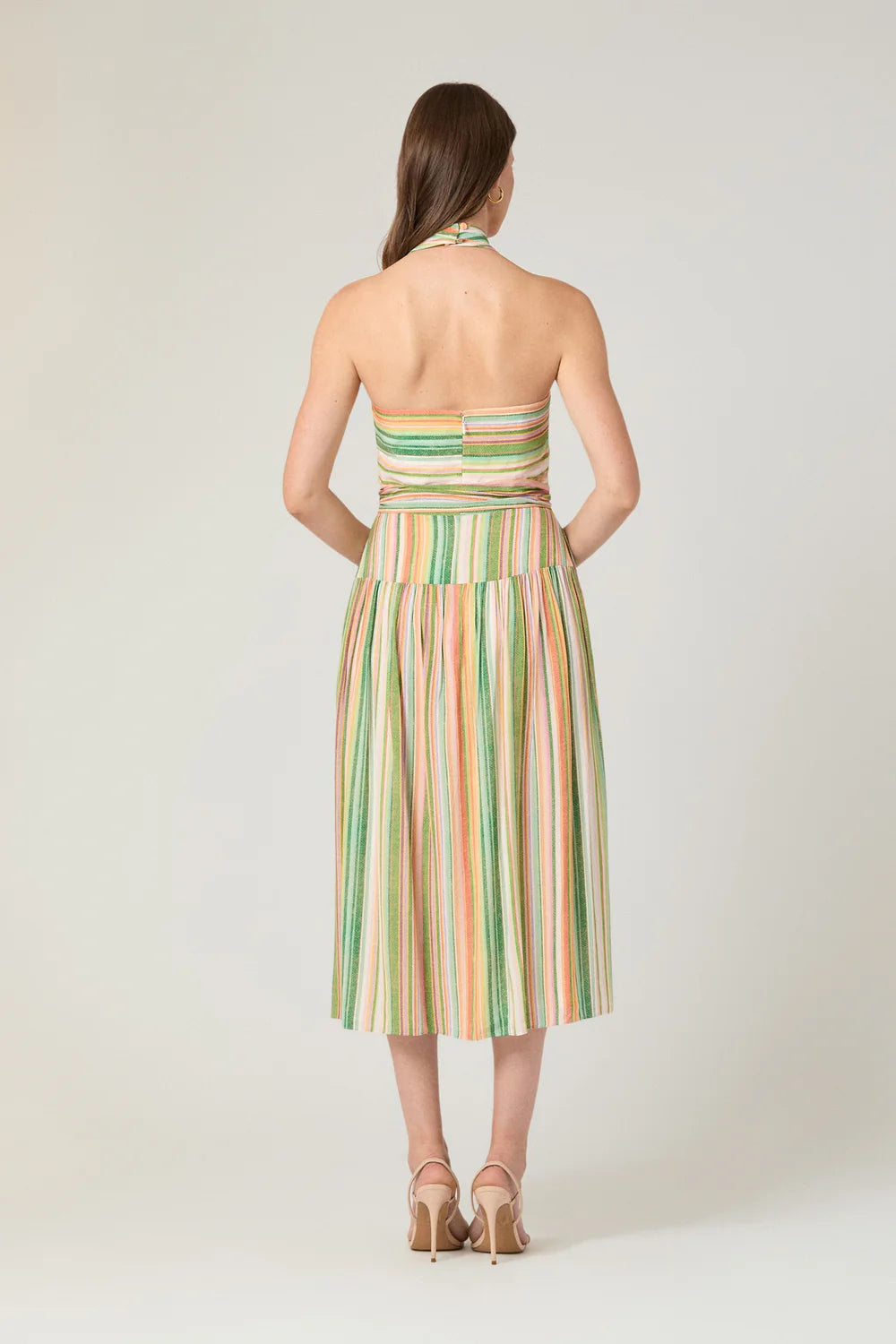 Vibrant and elegant, this sleeveless crepe de chine dress features bold multicolor stripes and a striking halter neckline that crosses in front and fastens with a hook-and-eye at the back. The fitted bodice is complemented by an adjustable tie belt at the waist, flowing into a graceful midi-length A-line skirt. Fully lined with interior boning for structure and a hidden back zipper for a smooth finish.