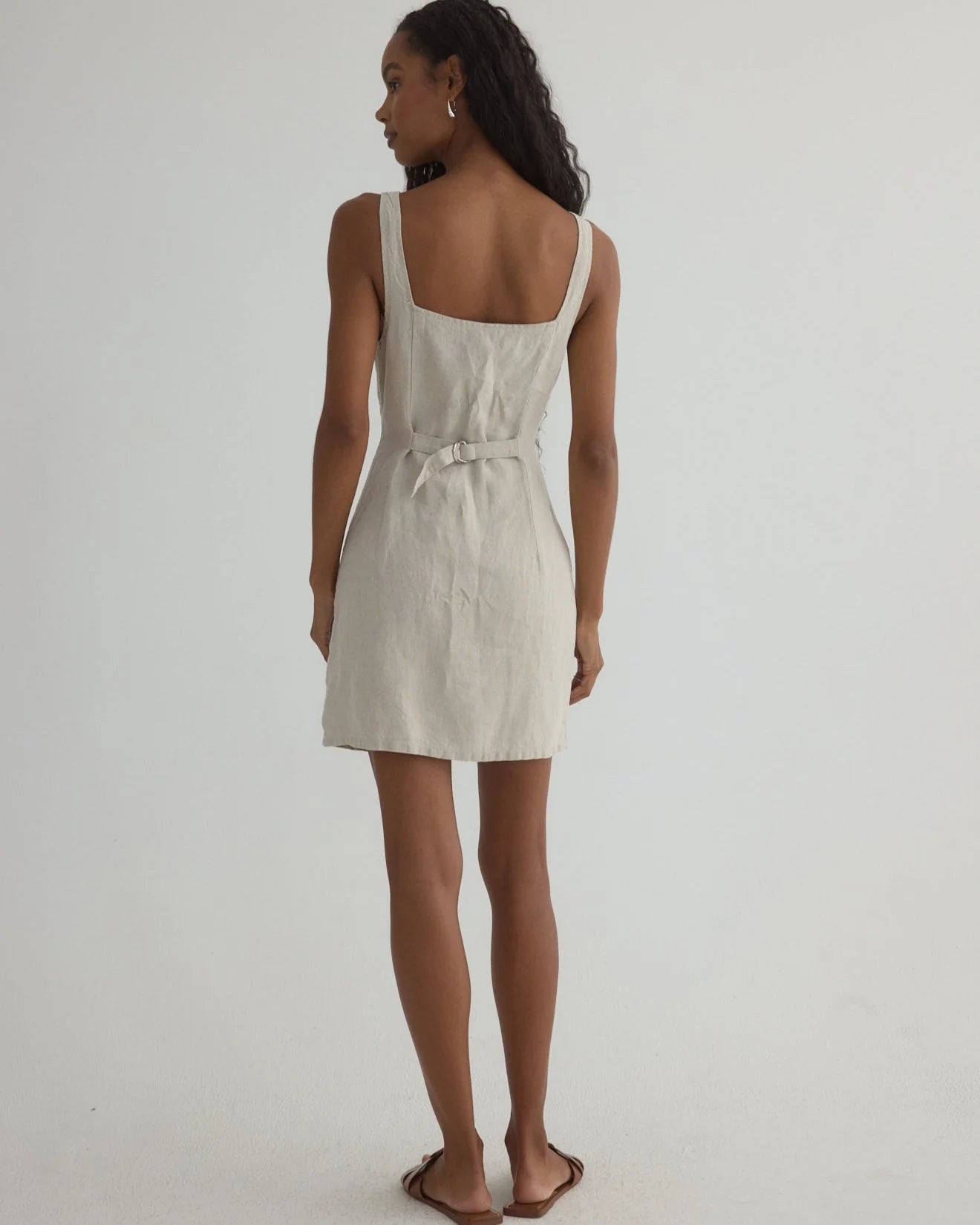 The Linen Scoop Neck Button Front Mini Dress is a warm-weather staple you’ll reach for all season.