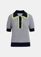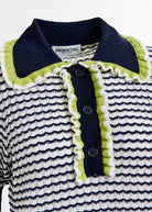This polo offers a relaxed fit through the bodice, gently tapering at the hips—perfect for pairing with high-waisted pants or skirts. A ruffled collar adds a touch of elegance, while the striped pattern and contrasting trims create a striking, eye-catching look.