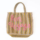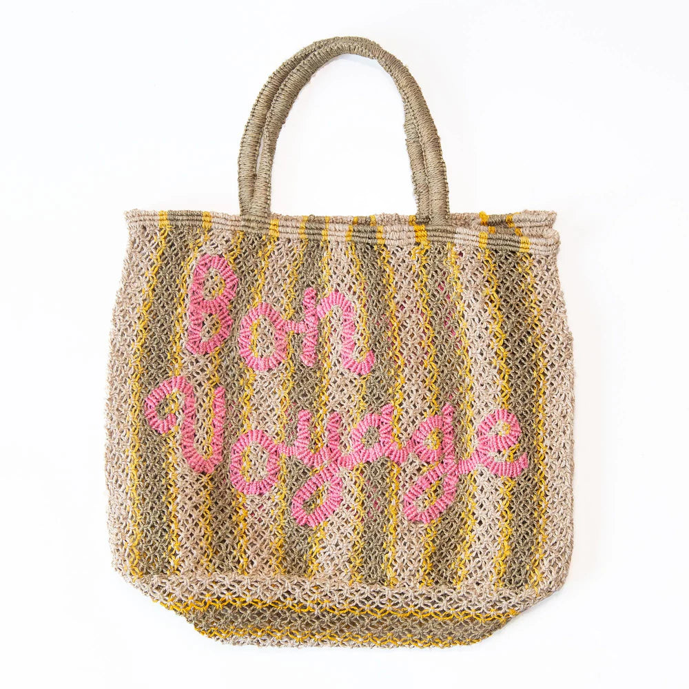 Made of jute - a very strong fiber that holds up to 30 lbs for the Large tote.