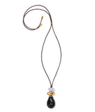 - Leather cord, chalcedony, gold-plated brass, black onyx