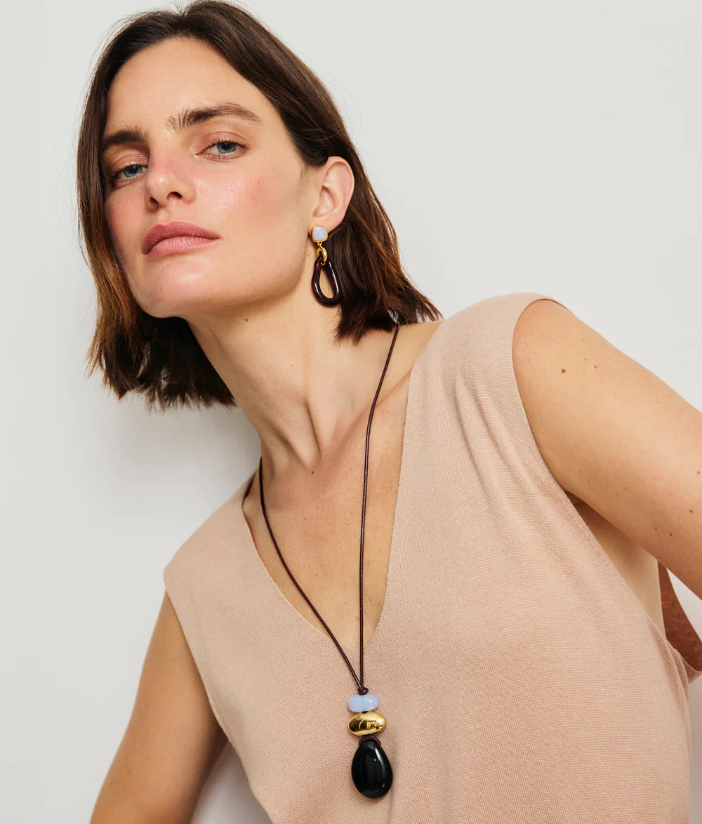 This statement necklace features a rich dark brown leather cord accented with stacked chalcedony and gold-plated brass beads, finished with a striking black onyx teardrop pendant. A bold yet versatile piece, it’s an easy way to add depth and polish to your fall and winter looks.