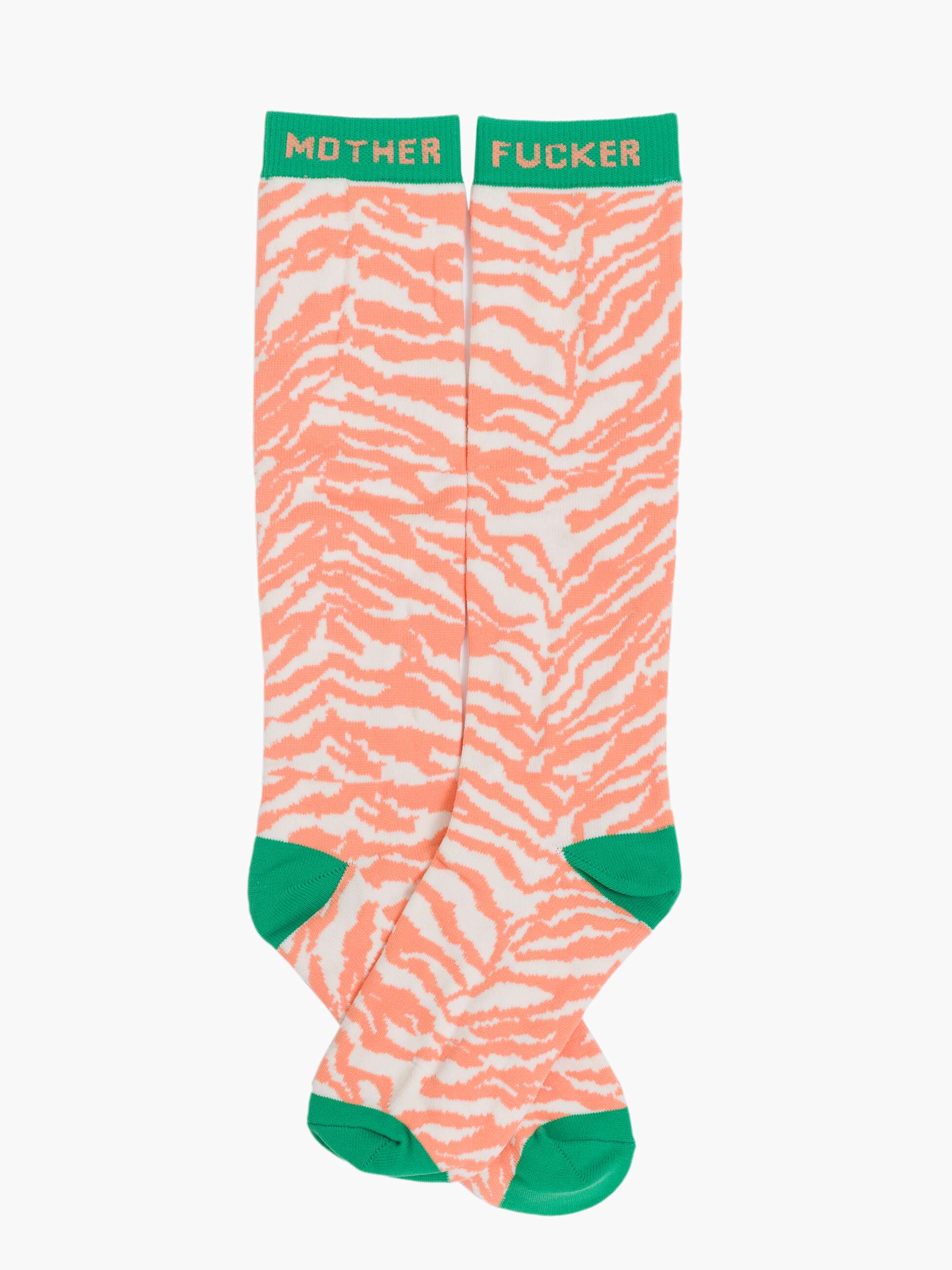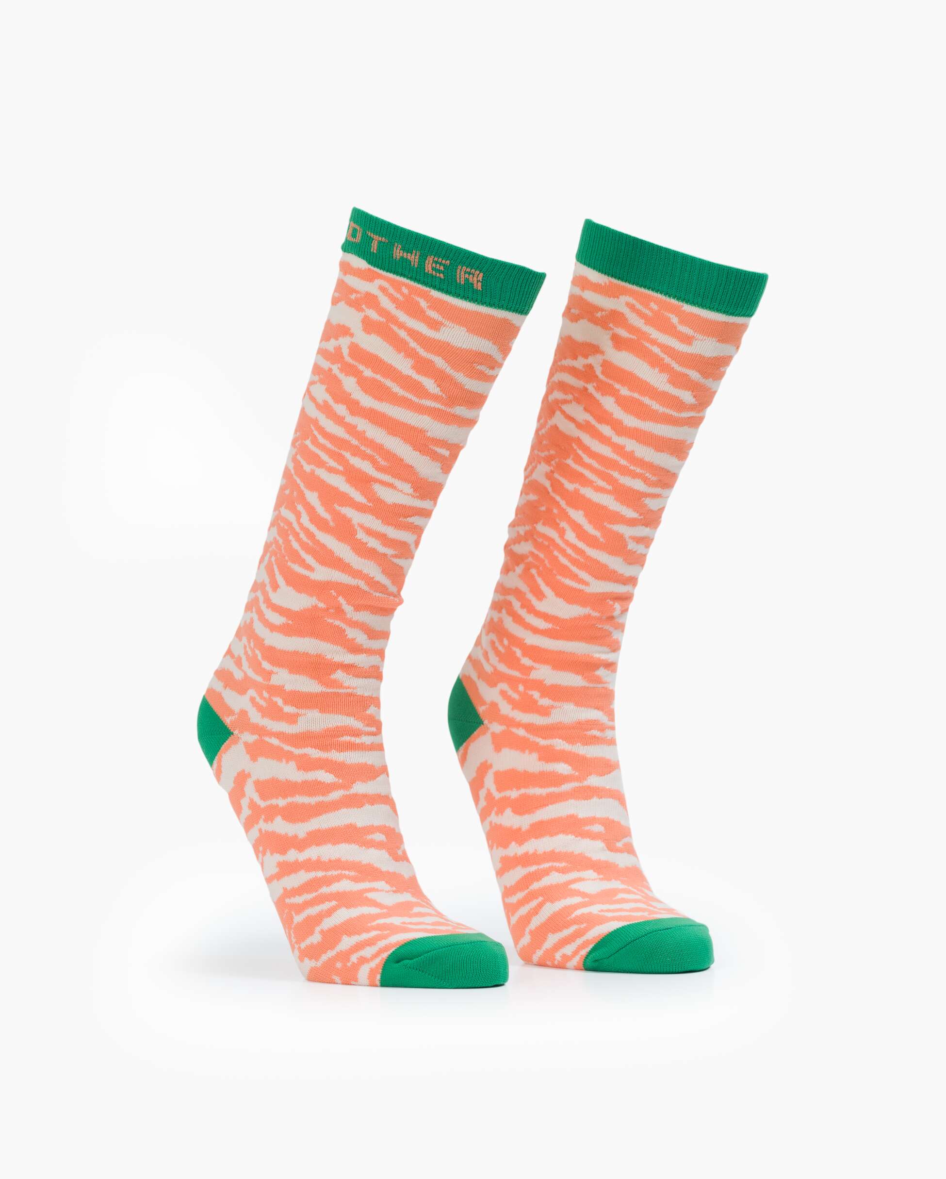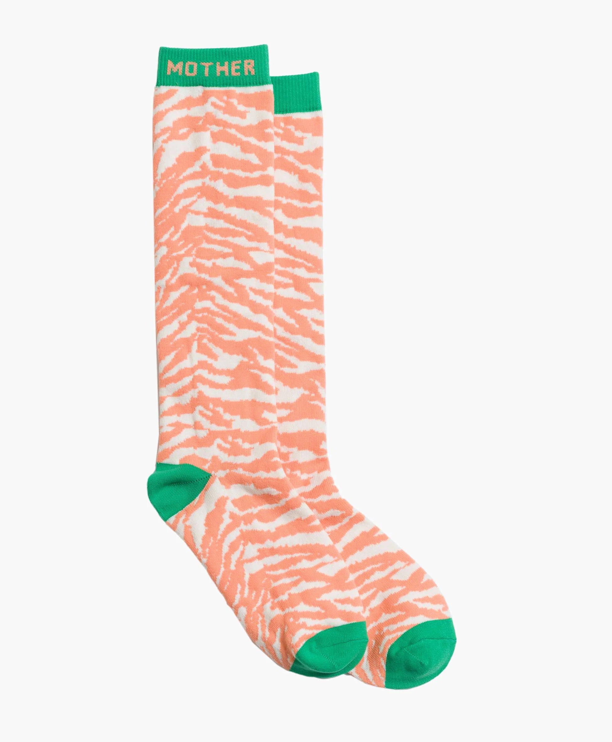 Go wild. These classic tube socks come in off-white with a bold orange zebra print, green accents, and a playful message from MOTHER, making a fun and unique statement with every step.
