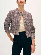 This cropped sweater blends cozy texture with refined detail. Knit from a marled yarn in rich tones of burgundy, cream, and charcoal, it features a crew neckline, long sleeves, and a subtle button-front closure. The soft, chunky knit offers warmth with a modern, boxy silhouette that pairs effortlessly with high-rise denim or tailored trousers.