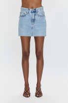 A fresh take on the classic mini. The Skye skirt is crafted from rigid denim in the Apollo wash, a true light blue with vintage-inspired fading. Designed with a flattering high-rise waist and finished with silver dome studs for a playful edge. Perfect for warm-weather styling—pair it with a tee or a tucked-in blouse for effortless cool.