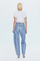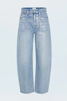The Wes jean features a flattering high rise and barrel-leg silhouette with a full-length 30" inseam that adds modern drama. Crafted from premium rigid non-stretch denim in Spellbound—a luminous light blue wash that catches the light beautifully. Finished with a clean hem and branded metallic back patch for a polished, signature touch.