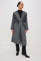 Wrap yourself in the Arlon, a hooded wool jacket that blends ease with sophistication. Designed with a shawl collar, fringe trim, adjustable tie belt, and side patch pockets, it’s the perfect statement layer for effortless, elevated style.