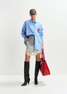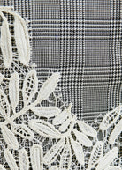 Cut from a slightly stretchy striped fabric, this skirt is designed to hug the figure with a close, flattering fit. Slanted pockets and a clean zip-and-button closure keep the look tailored, while belt loops offer versatile styling options. The asymmetrical hemline is elevated with delicate floral lace appliqué, adding unexpected contrast and texture. Fully lined for smooth structure, this piece blends everyday sophistication with a touch of romance.