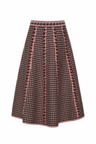 This Cara Cara skirt is a striking midi-length piece that blends classic pattern with playful detailing. Crafted in a bold houndstooth jacquard, it features alternating vertical panels in blush pink, burgundy, and black for a slimming and structured effect. The elastic waistband is finished with a matching houndstooth motif, offering comfort with a polished edge. Its A-line silhouette flatters every figure, making it a standout style for pairing with tucked-in knits or crisp button-downs. A perfect mix of timeless and contemporary.