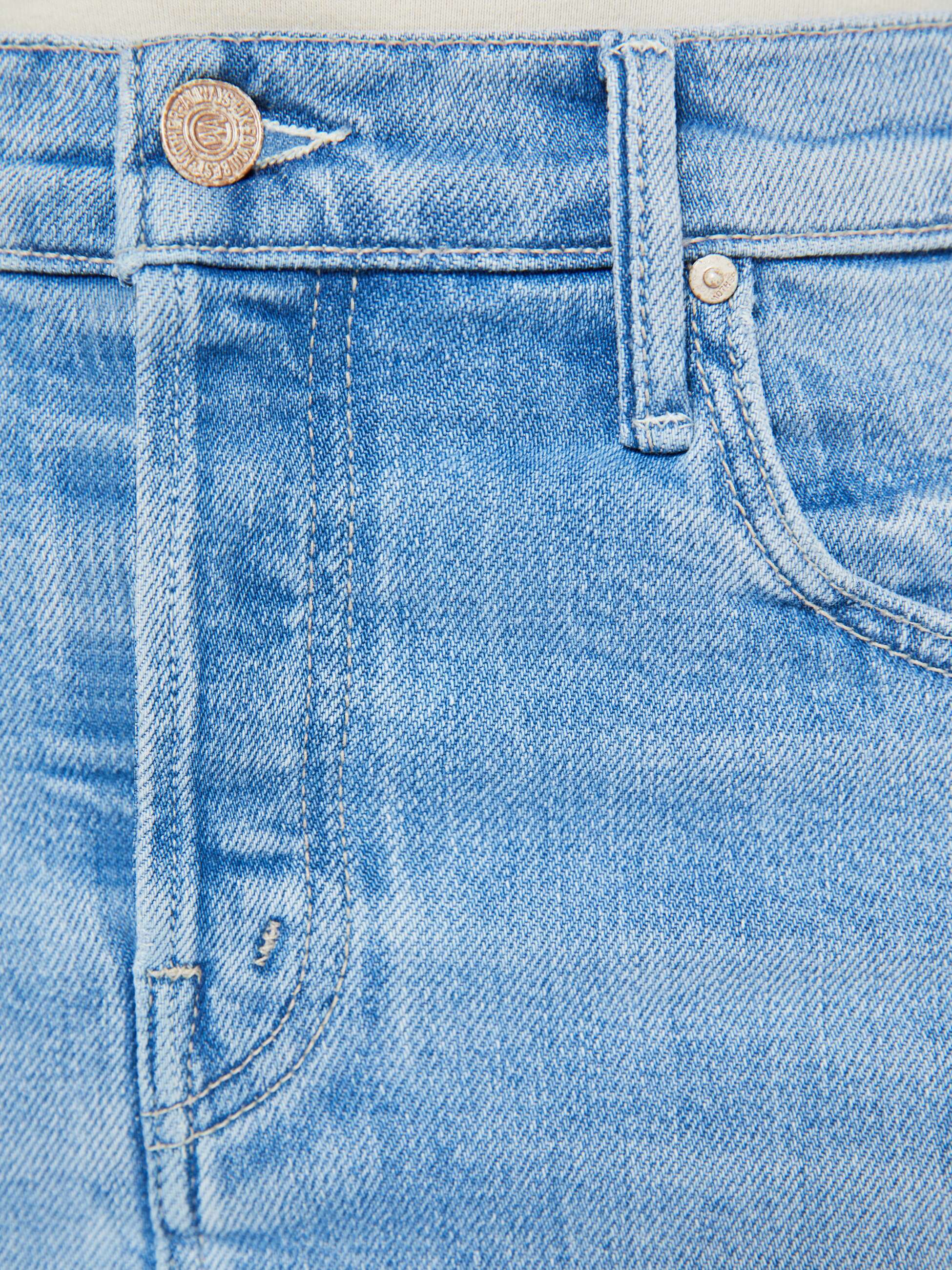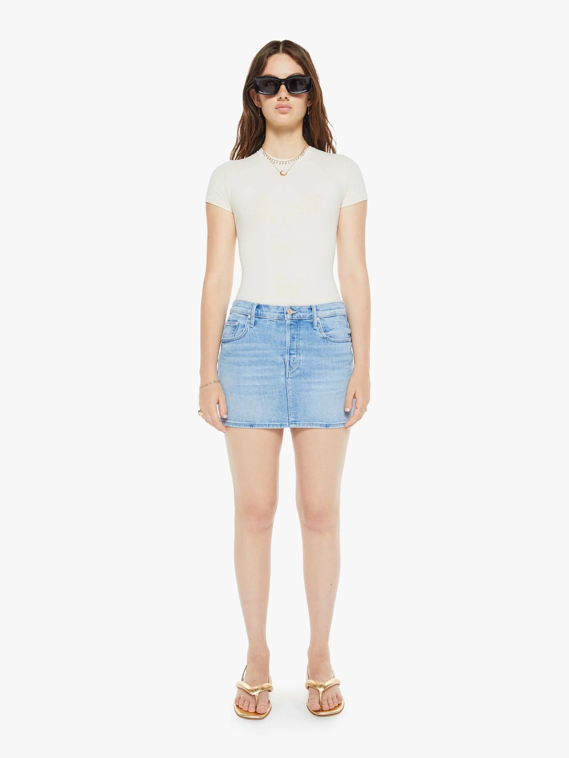 Ride the airwaves. This denim mini skirt sits lower on the hips with a button fly, slim fit, and a thigh-grazing hem. Made from stretch denim, Tune In, Tune Out features a light blue wash with subtle whiskering and fading for a perfectly worn-in look.