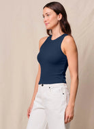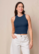 Fine 2x1 Rib Cropped High Neck Tank in Navy