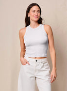A finely knit 2X1 rib cropped tank featuring a high neckline and a flattering, body-hugging fit. Crafted from soft, buttery fabric that moves with you, it’s the perfect blend of comfort and style.