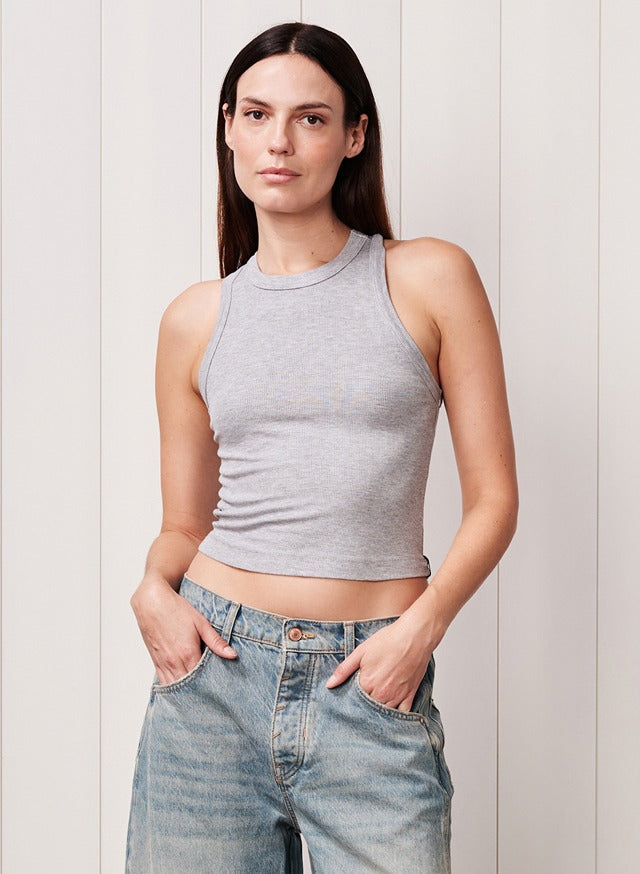 Fine 2x1 Rib Cropped High Neck Tank Top in Heather Grey