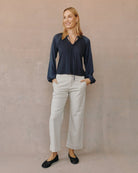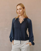 The Long Sleeve Raglan Mixed Shirt brings effortless style to your everyday wardrobe. Crafted with a soft, textural feel, it features a versatile V-neckline with adjustable ties, raglan sleeves with gentle gathers, and elastic cuffs for a touch of volume. A relaxed fit through the body makes it as comfortable as it is chic.