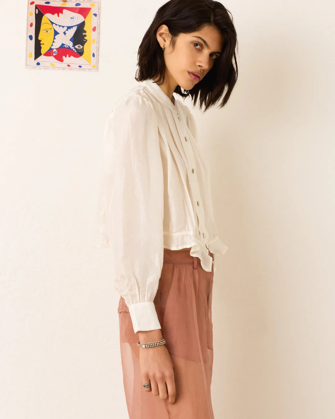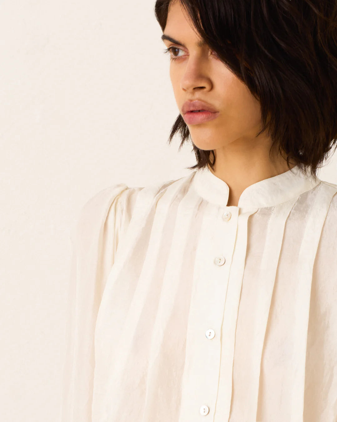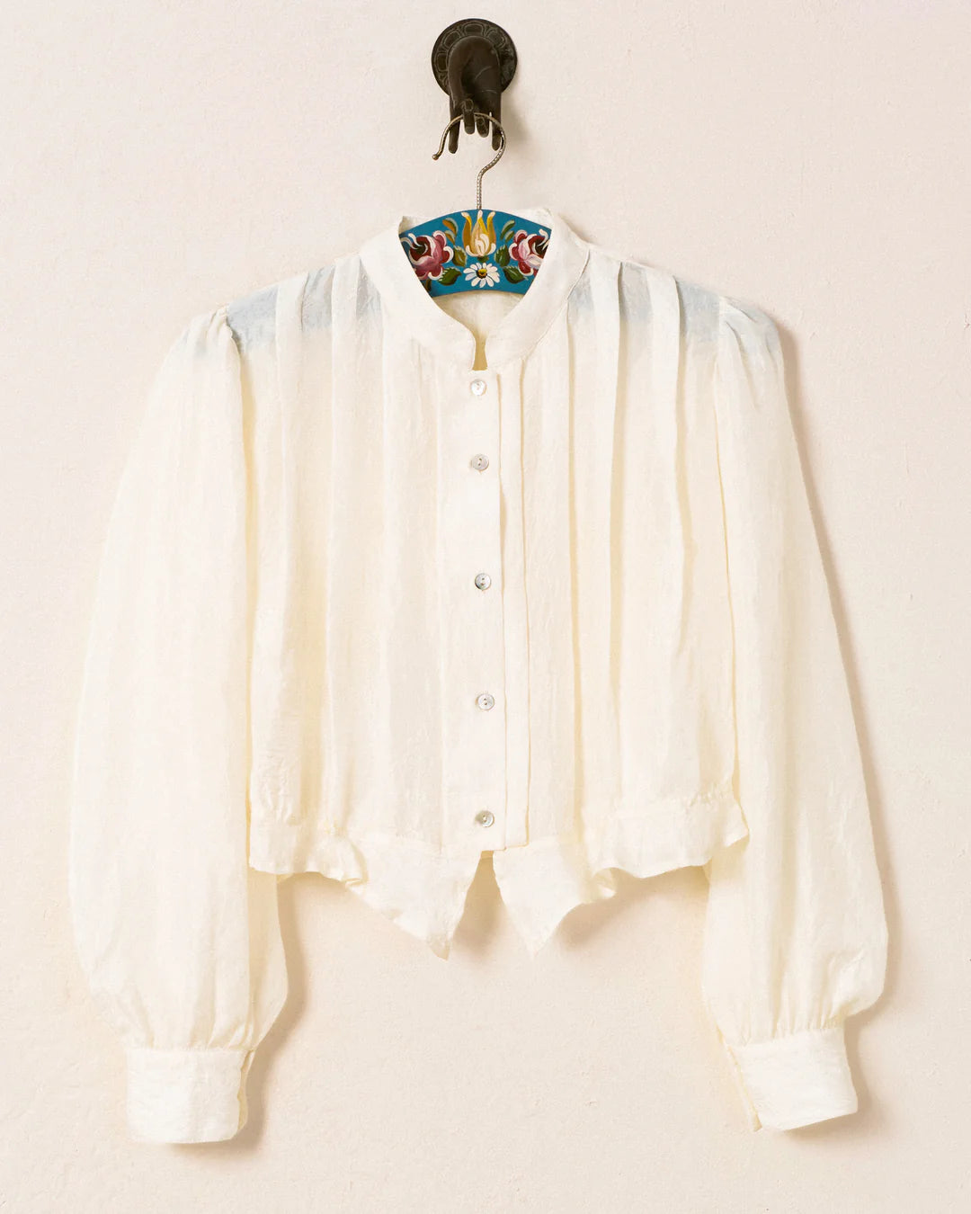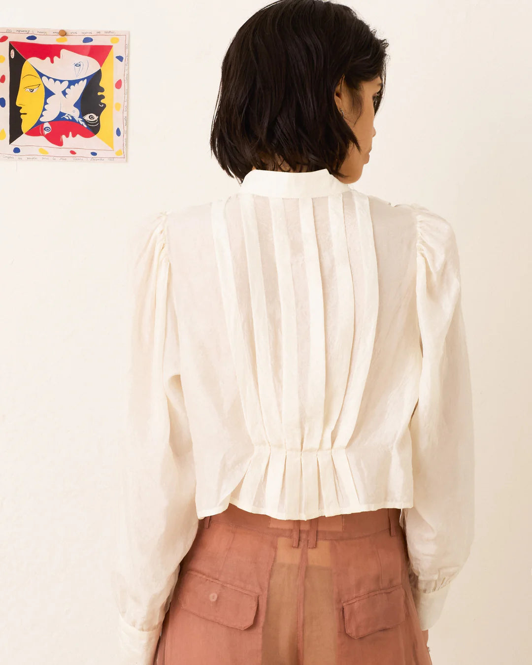 Romantic and refined, this cropped shirt is inspired by the timeless elegance of a Victorian blouse. Crafted from hand-loomed silk, it features intricate pleating details that add structure while maintaining a feather-light, delicate feel. The silhouette is both nostalgic and modern—perfectly paired with high-waisted trousers for an effortlessly polished look. Due to the artisanal weaving process, each piece carries unique variations that highlight the craftsmanship behind every garment.