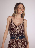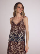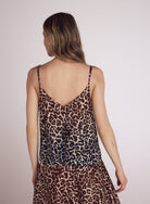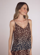 Sleek and versatile, this V-neck cami features a bold animal print that adds instant edge to any outfit. Designed with adjustable spaghetti straps for a custom fit, it drapes effortlessly for a flattering silhouette. Wear it solo on warm days or layered under a blazer or cardigan for year-round style.