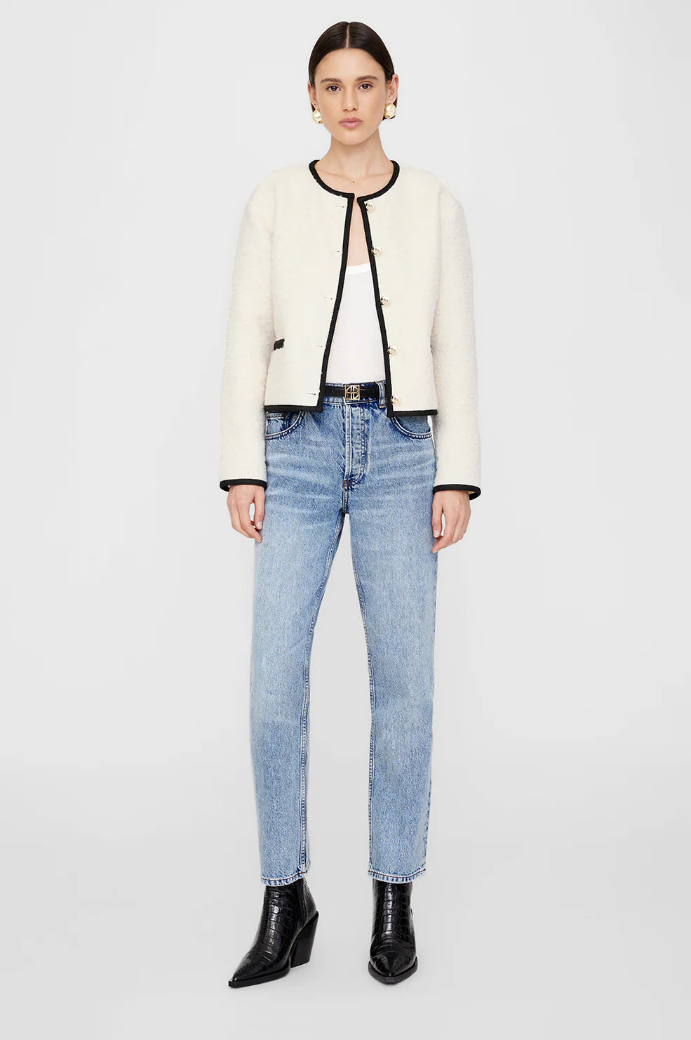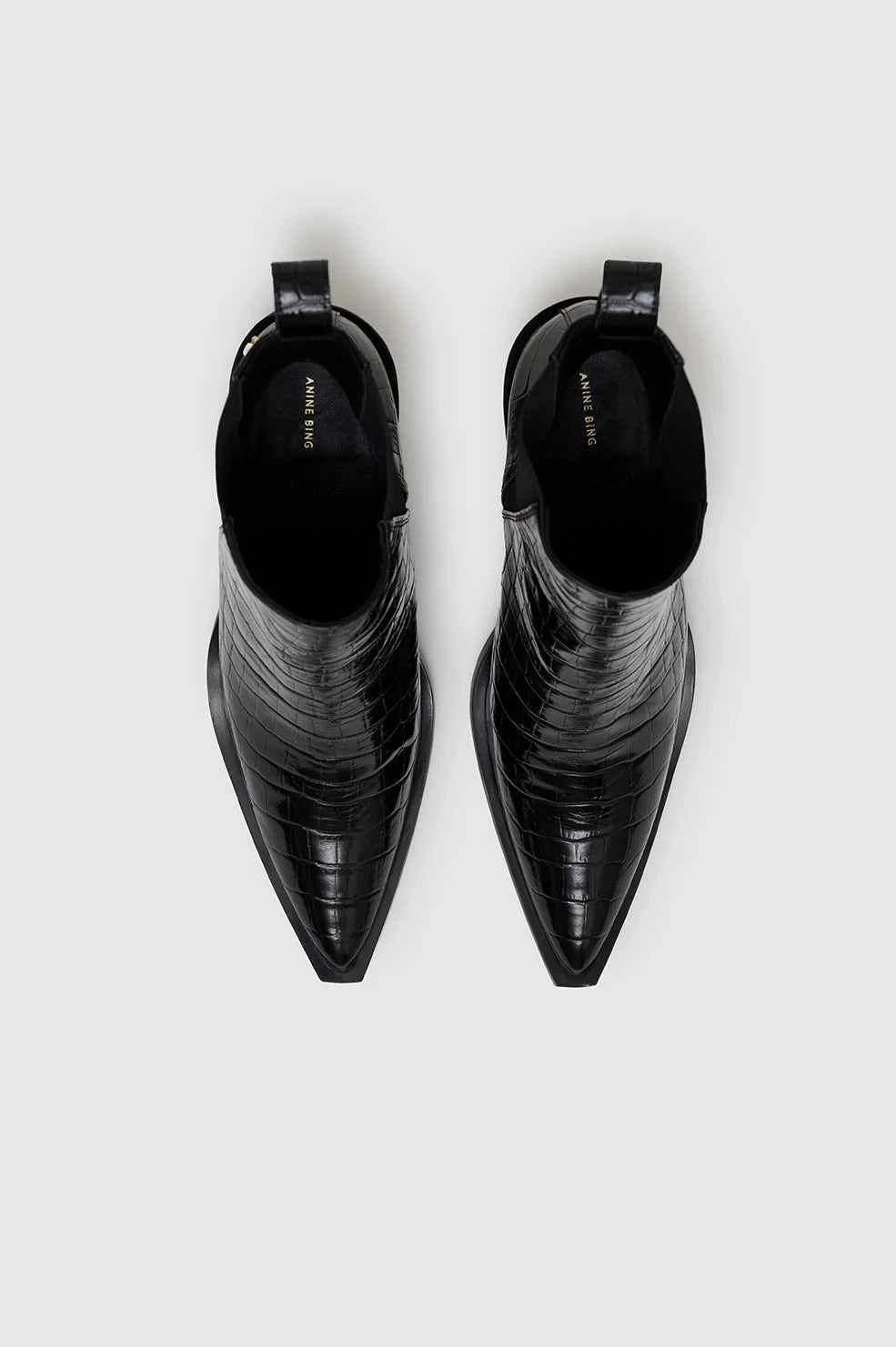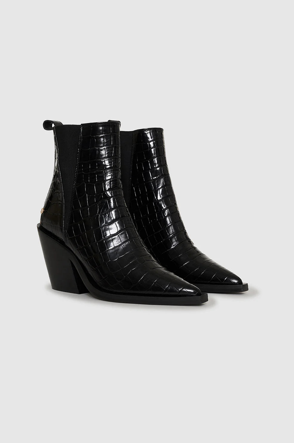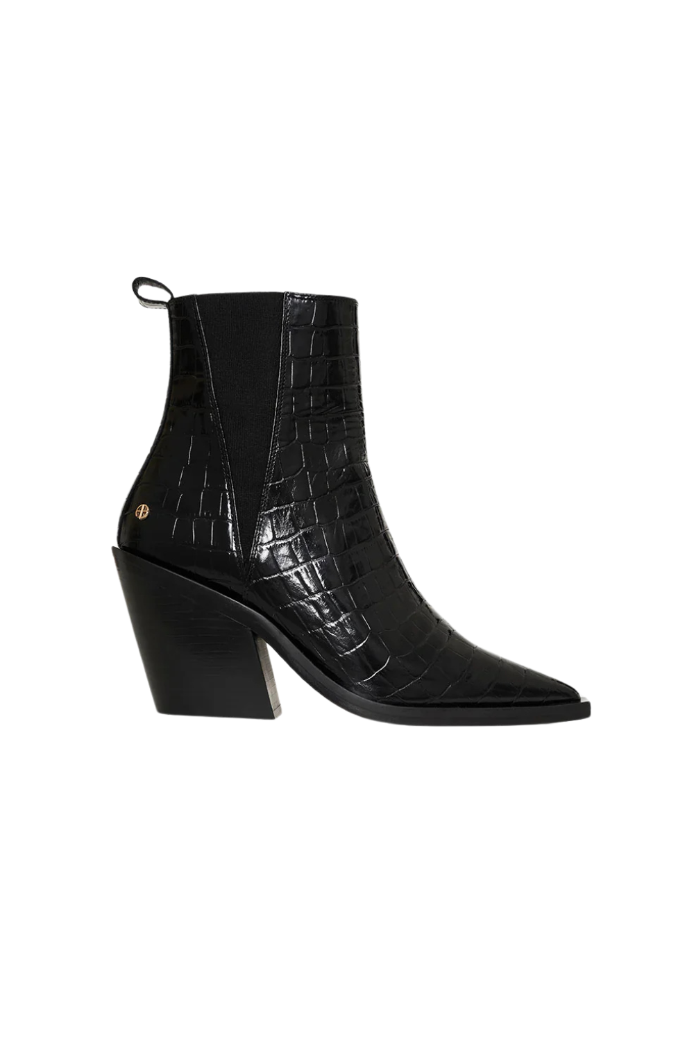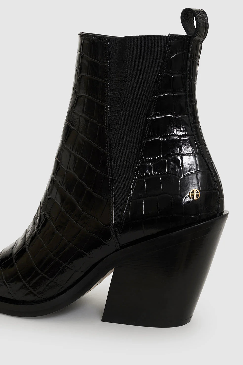 The Bekah Boots are made from glossy 100% leather, featuring a chic faux croc-embossed texture. This standout pair showcases a pointed toe framed by a sharp square outsole, a slanted Cuban heel, elastic gores, and back pull tabs. They’re finished with a cushioned insole and a touch of gold-tone Anine Bing hardware at each heel.