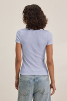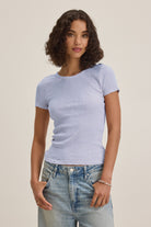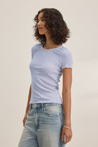 Crafted from a soft cotton-modal blend, this fitted tee features delicate ribbed pointelle for a touch of texture. A scalloped crew neckline and short sleeves lend a refined, feminine finish—perfect for effortless everyday style.