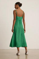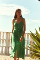 This woven linen tank dress combines relaxed elegance with thoughtful details. Designed with a flattering V-neck and decorative button front, it features elastic straps and a gathered back waist for a comfortable, flexible fit. A front slit adds a modern touch, making it an effortless choice for warm, sunny days.