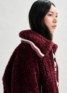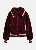Oversized bomber jacket in high-pile faux shearling with a plush, textured feel. Designed with a full zip closure, ribbed knit trims, and contrasting stripe details for a sporty, graphic finish. Fully lined with functional side pockets, it balances style and practicality for cooler days.