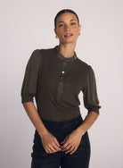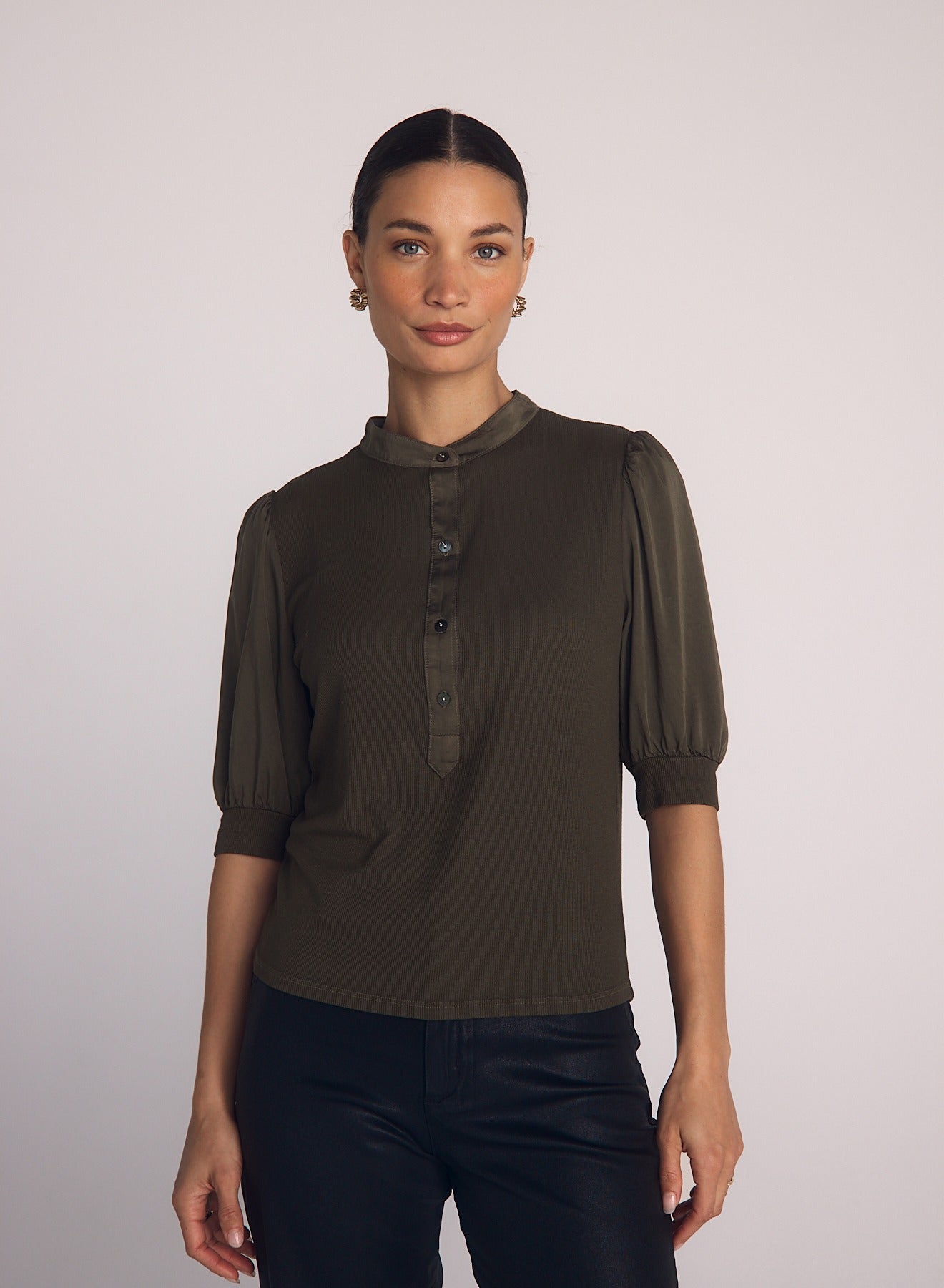 Breezy and versatile, the Short Sleeve Placket Mixed Shirt is your go-to for warm days and cool mornings. Designed with a Henley-style button placket, softly puffed short sleeves with elastic cuffs, and a relaxed silhouette, it offers an easy blend of polish and comfort.