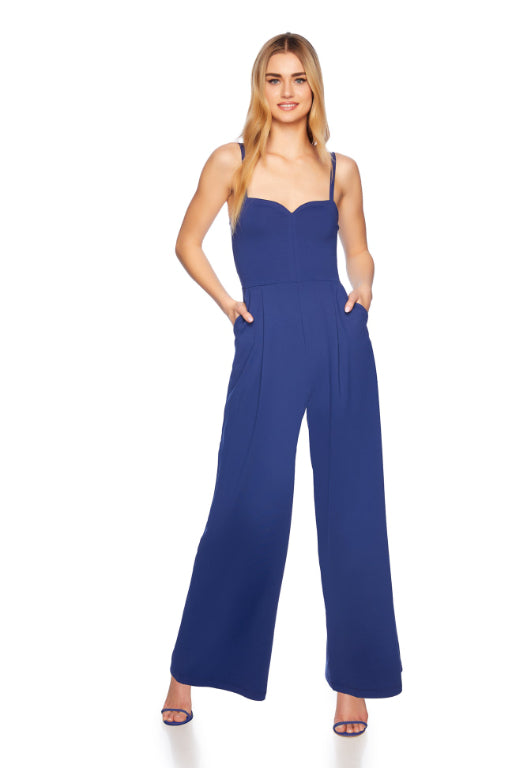 this versatile one-piece combines a polished silhouette with a touch of playful charm. the fitted bodice with a sweetheart neckline accentuates your curves and highlights your décolletage, while the wide-leg pants elongate your legs and create a graceful flow. pair this with your favorite heels and a strappy bag to complete the look.